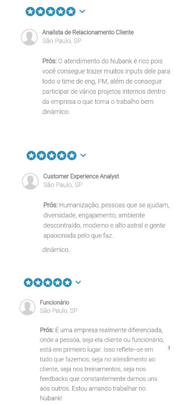 Veja alguns depoimentos do time de atendimento (tem alguém que representa melhor a gemba?) da Nubank no Glassdoor: